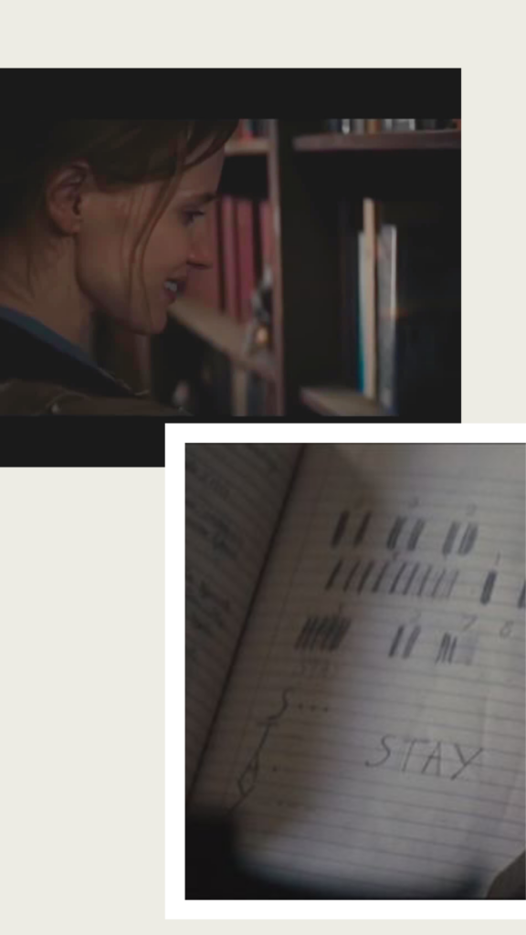 W scenie bolesnego pożegnania Cooper błaga swoją wersję z przeszłości o pozostanie w domu z córką. Wiadomość zostaje rozszyfrowana przez samą Murph. Ojciec jednak kierowany może misją zbawienia świata, a może własnym ego nie ulega naciskom. Trzeba przyznać, że jest to jest bardzo mocna i emocjonalna scena… Półka z książkami jest tutaj symbolem wiedzy oraz nauki, które są bramą do ocalenia ludzkości.